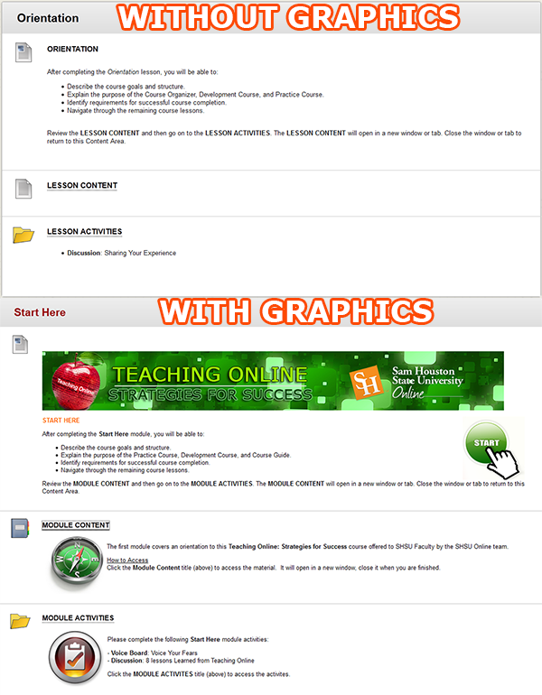 Below are examples of a Blackboard content area without graphics and a content area with graphics.  Which one looks better?  Which one would you rather read?