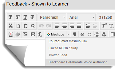 Audio Feedback with Blackboard Collaborate Voice AuthoringAt SHSU, Blackboard is the Learning Management System for online, hybrid and web-enhanced course offerings, and it comes equipped with tools that can enhance the feedback experience.  It also interacts well with third party tools and other types of files that can fulfill the same type of need for students.  For example faculty can use the Blackboard Collaborate Voice Authoring Mashup to leave audio feedback directly in the feedback of the assignment.